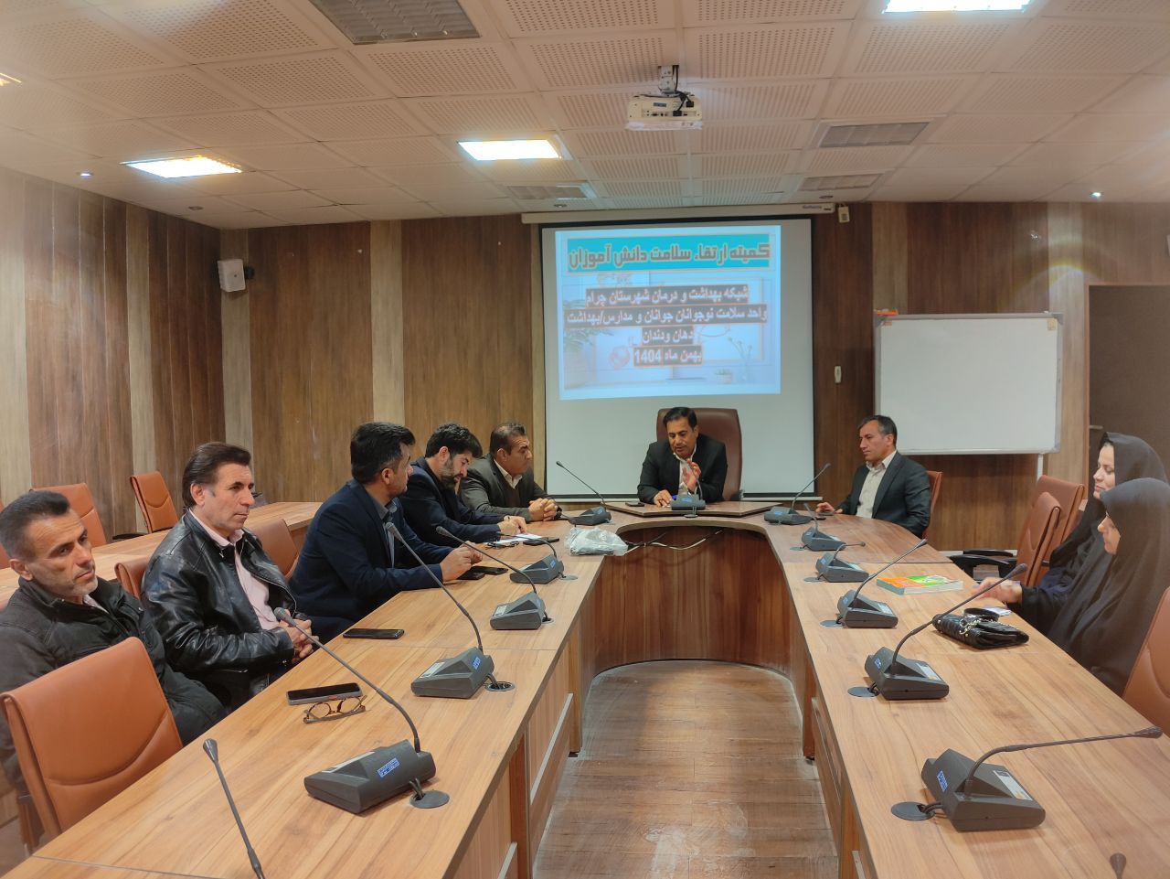 حسین جعفری مدیر شبکه بهداشت و درمان با بیان اهمیت سلامت دانش آموزان و خدمات مراقبتی و آموزشی که از طرف این شبکه برا دانش آموزان ارائه می شود، لزوم همکاری ها و هماهنگی های بین بخشی را برای حفظ و ارتقاء سلامت جسمی و روانی نوجوانان مهم و تعیین کننده دانست. در این جلسه که معاونین، مربیان بهداشت و کارشناسان مرتبط حضور داشتند دستور کار جلسه که شامل تکمیل معاینات دانش آموزان، بازدیدهای مشترک و پیگیری مکاتبات همچنین توزیع کاربرگ های کمک آموزشی بهداشت دهان و دندان در مدارس بود توسط کارشناس بهداشت مدارس و بهداشت دهان و دندان ارائه شد و پیشنهاد و درخواست های حاضرین به شکل مصوبات تدوین گردید