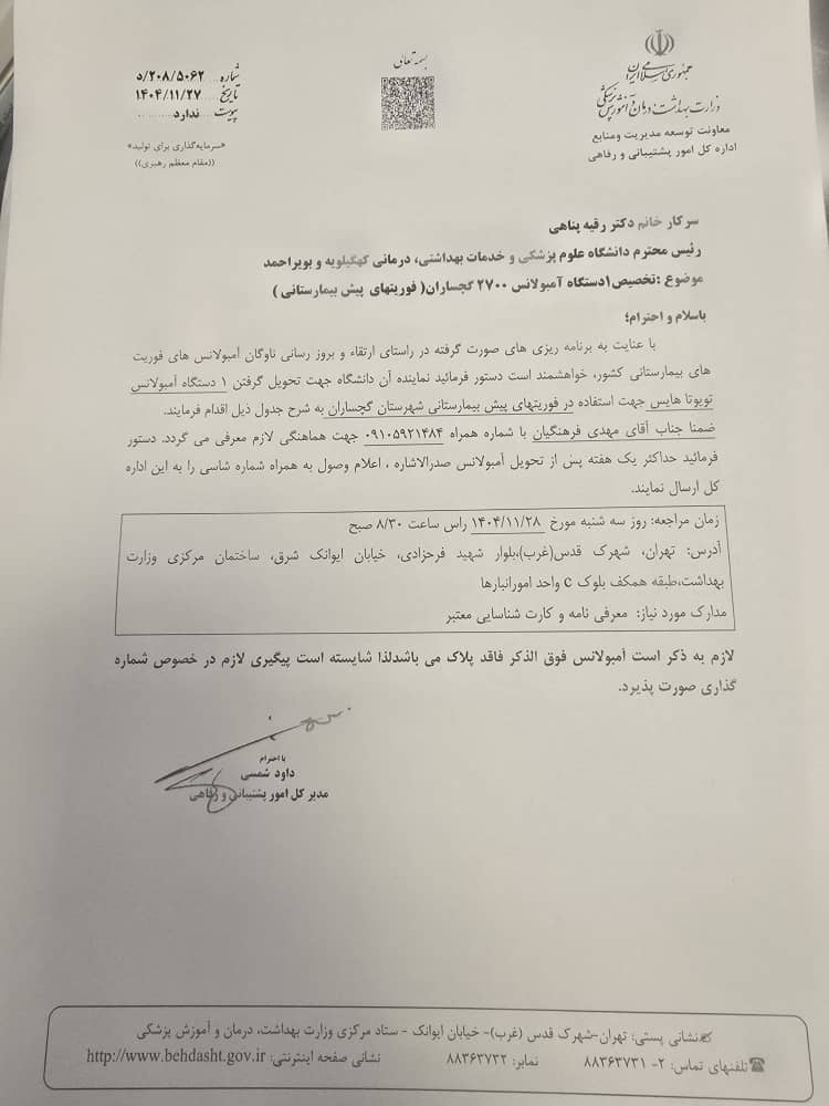 این اقدام با پیگیریهای دانشگاه علوم پزشکی یاسوج و در چارچوب برنامههای ارتقای خدمات فوریتهای پزشکی انجام شده است. بر اساس ابلاغ معاونت توسعه مدیریت و منابع وزارت بهداشت، فرآیند تحویل خودرو و هماهنگیهای اداری مربوطه در حال انجام است و پس از طی مراحل قانونی، این آمبولانس وارد چرخه خدمترسانی خواهد شد.