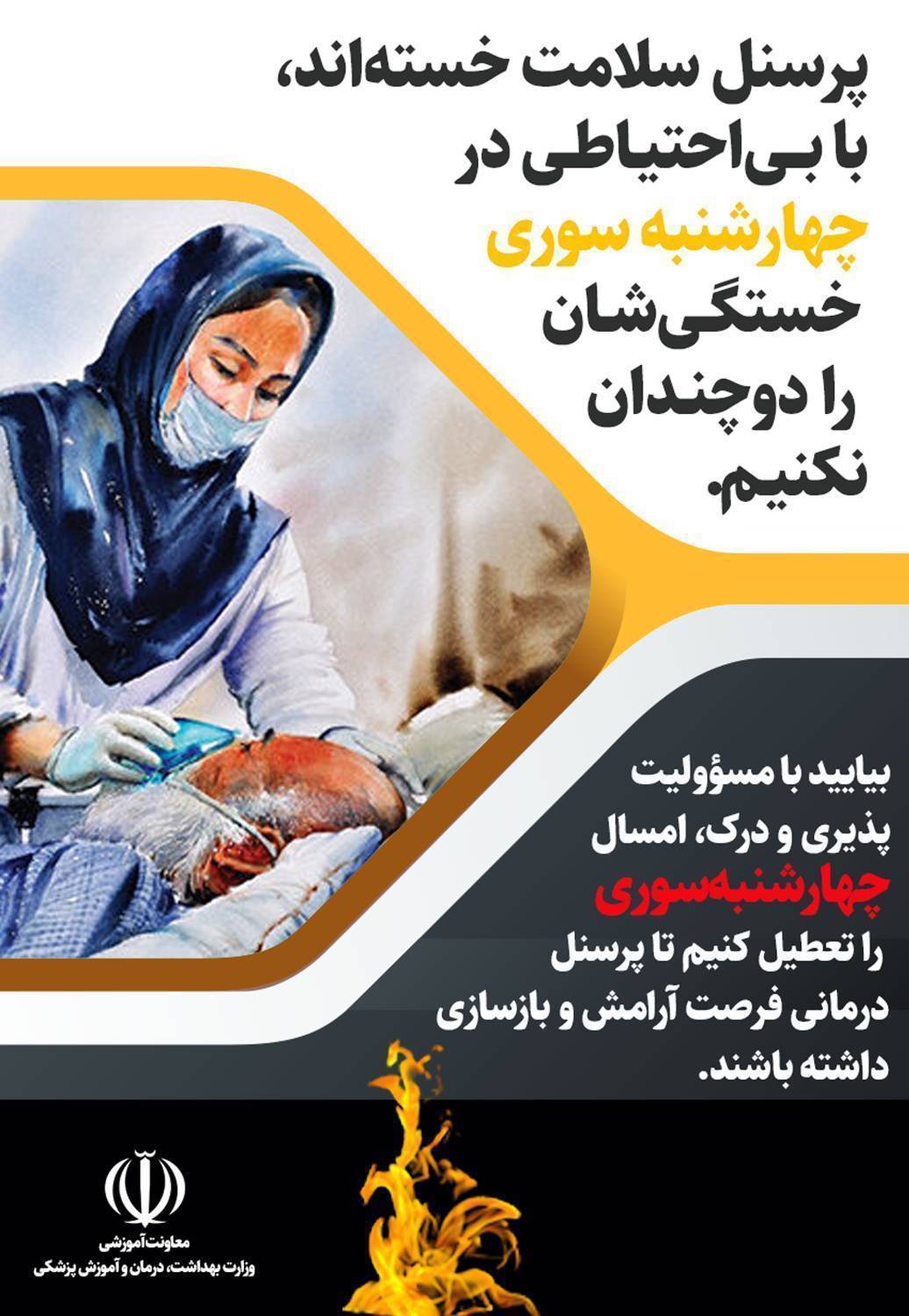 به گزارش روابط عمومی شبکه بهداشت و درمان شهرستان باشت: طی نشستی که در جلسه مدیریت بحران شبکه بهداشت و درمان این شهرستان برگزار شد، سرپرست شبکه از عموم مردم عزیز به منظور حفظ سلامت جسمی و جلوگیری از برهم خوردن آرامش عمومی جامعه و همچنین تشویق مردم به مسئولیت پذیری و درک شرایط کاری کادر درمان در این روزهای بحرانی، امسال چهارشنبه سوری را تعطیل کنیم تا پرسنل درمانی فرصت آرامش و بازسازی داشته باشند.