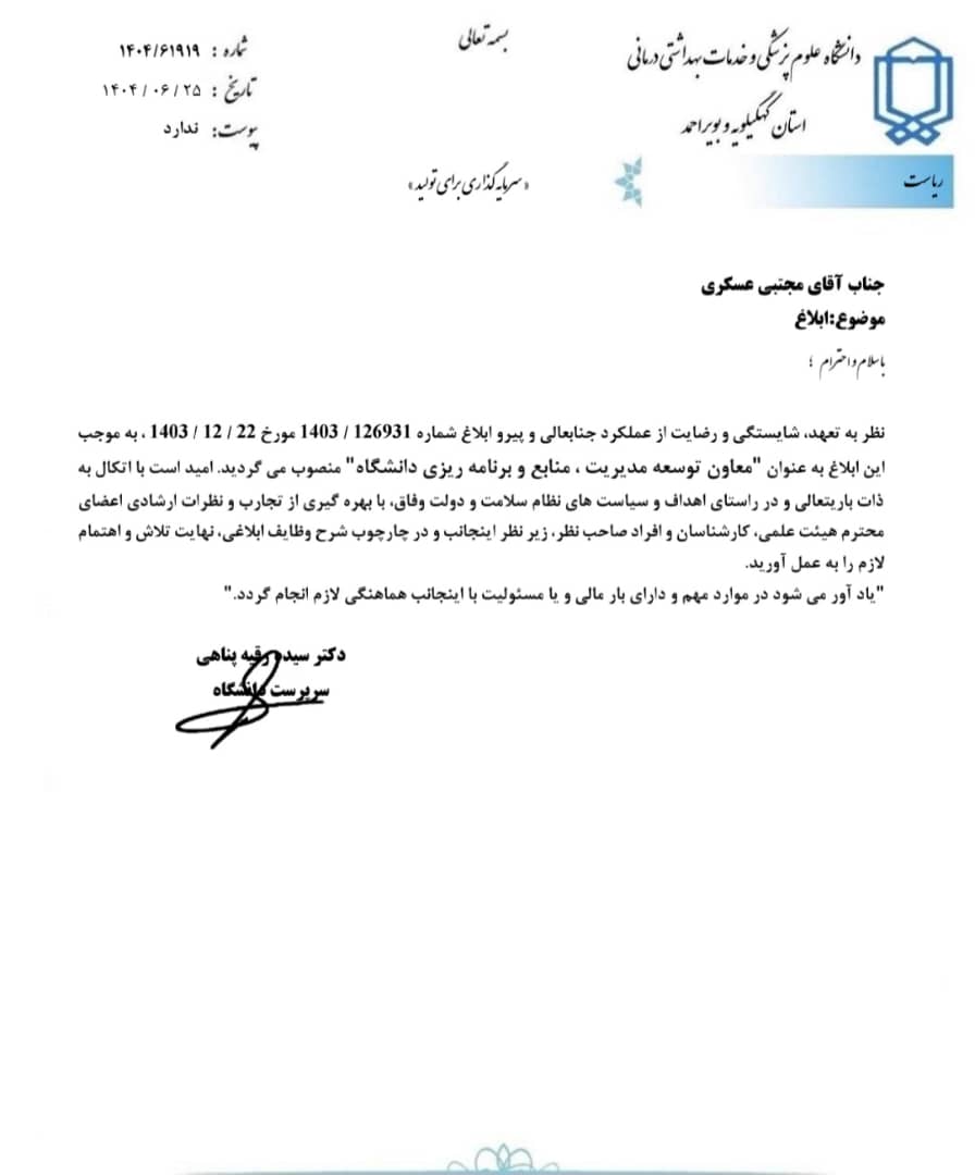 به گزارش روابط عمومی دانشگاه علوم پزشکی یاسوج؛ در بخشی از این حکم آمده است: