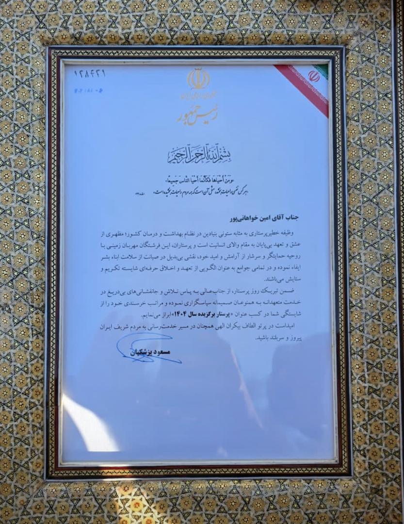 بر اساس اعلام معاونت پرستاری وزارت بهداشت، درمان و آموزش پزشکی، آقای امین خواهانی از دانشگاه علوم پزشکی یاسوج به عنوان پرستار برگزیده کشور در سال ۱۴۰۴ معرفی شد.
