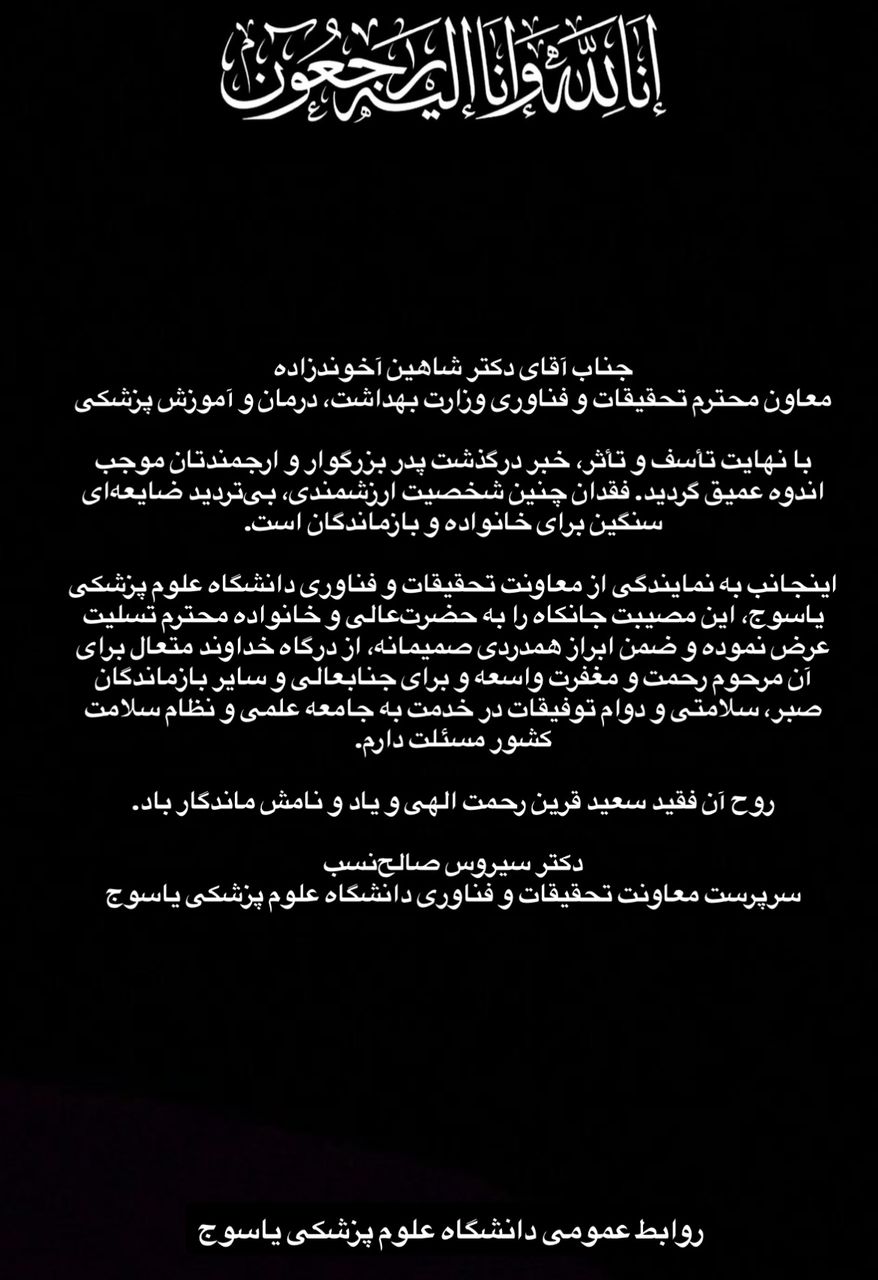 اینجانب به نمایندگی از معاونت تحقیقات و فناوری دانشگاه علوم پزشکی یاسوج، این مصیبت جانکاه را به حضرتعالی و خانواده محترم تسلیت عرض نموده و ضمن ابراز همدردی صمیمانه، از درگاه خداوند متعال برای آن مرحوم رحمت و مغفرت واسعه و برای جنابعالی و سایر بازماندگان صبر، سلامتی و دوام توفیقات در خدمت به جامعه علمی و نظام سلامت کشور مسئلت دارم.