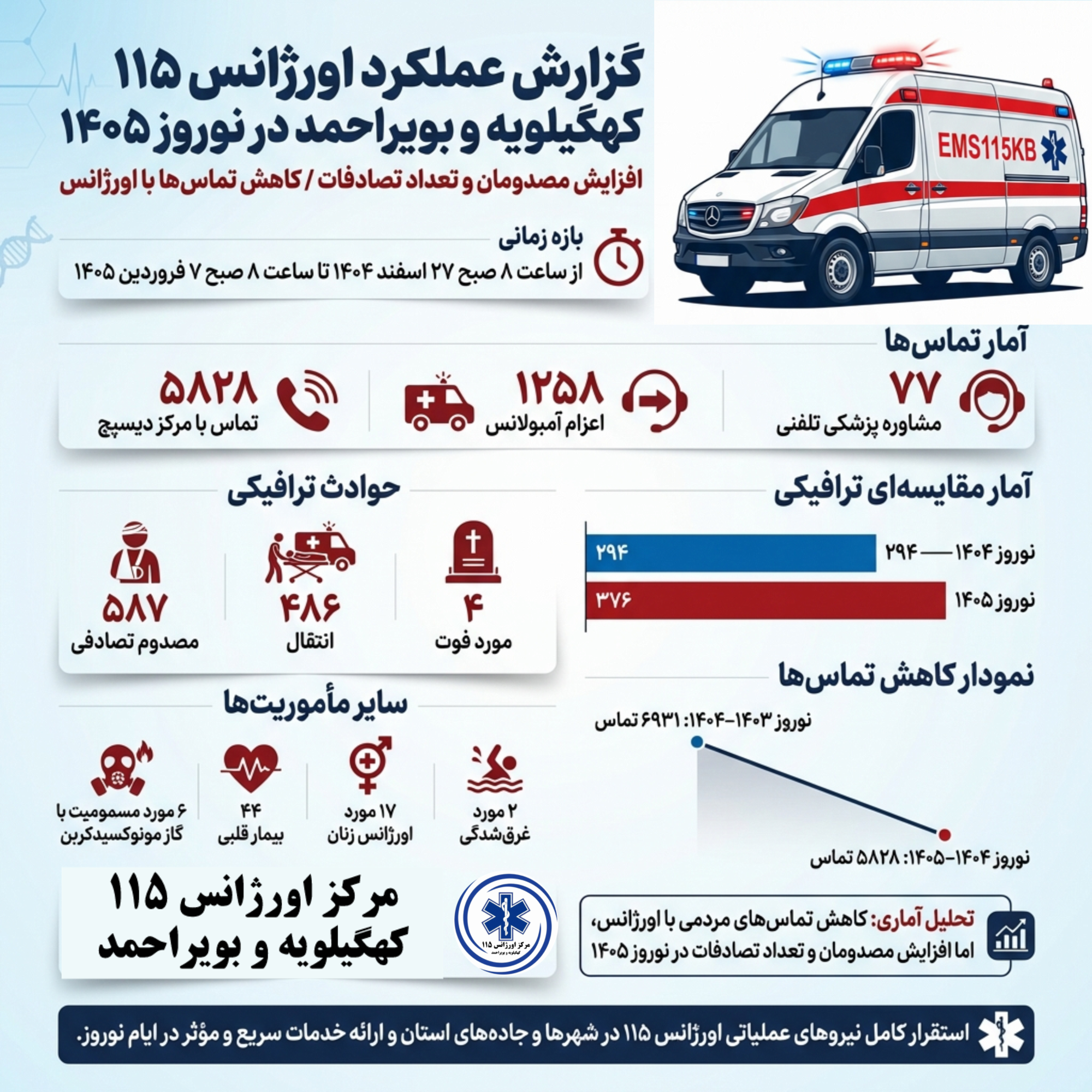 این در حالی است که تعداد کل تماسهای مردمی با اورژانس از ۶۹۳۱ تماس در نوروز ۱۴۰۳–۱۴۰۴ به ۵۸۲۸ تماس در نوروز ۱۴۰۴–۱۴۰۵ کاهش یافته است.